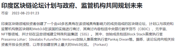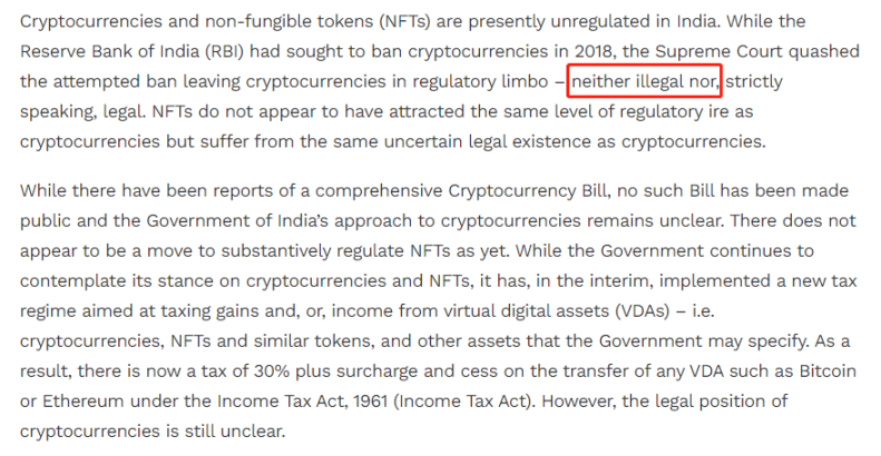 但是除此之外,印度政府对加密货币的态度仍不清楚,也没有对衍生产品例如 NFT 方面的监管和规定。用 Forbes 的网站新闻的话来说,既不违法也不严格来说是合法的。