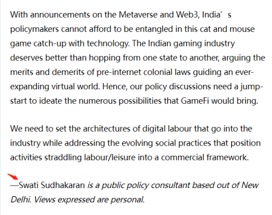 他认为,由于元宇宙和 Web3 的迅速发展,印度很难不能被卷入其中。对于这方面的政策和调整迫在眉睫。印度的政府需要尽快讨论关于 GameFi 将带来的众多可能性,以及相关行业的未来调整发展。