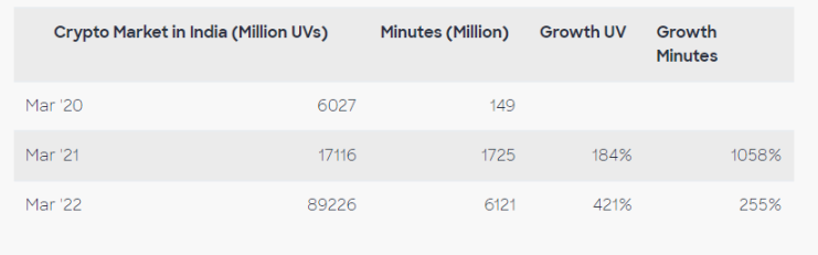 同时通过下方的图可以看到,印度近两年的用户增长速度是非常迅猛,特别是最近的牛市,UV(Unique Visitor 独立访客 ) 增长的量是非常巨大的。