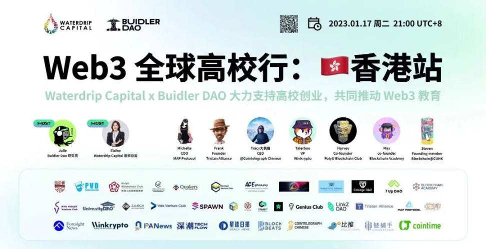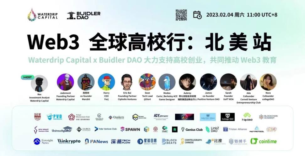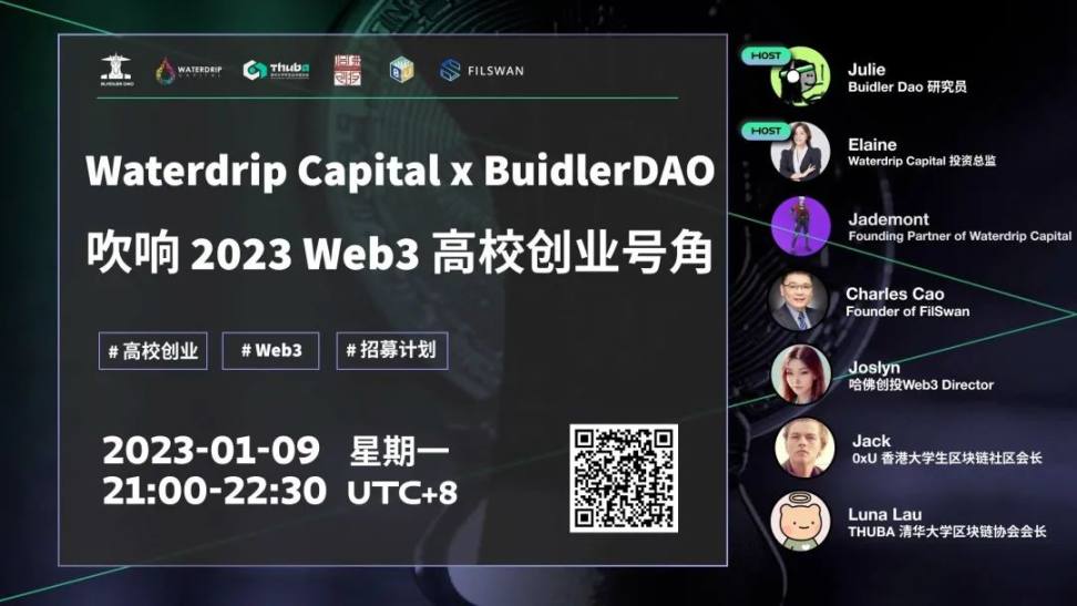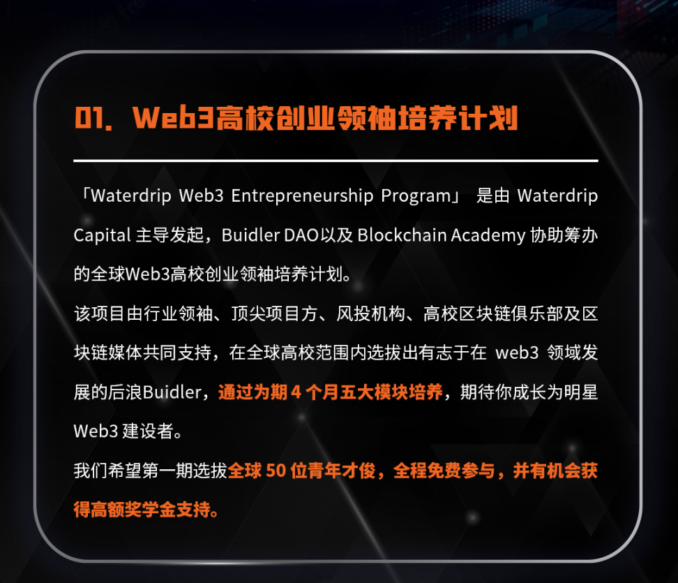 1、Waterdrip Capital 启动第一期全球 Web3 高校创业领袖计划 ---Waterdrip Web3 Entrepreneurship Program ,该计划是由 Waterdrip Capital 主导发起,由 Buidler DAO,Blockchain Academy 协助筹办。该项目获得行业领袖、顶尖项目方、风投机构、高校区块链俱乐部及区块链媒体共同支持;通过为期半年、五大模块培养,助力有志于在 web3 发展的后浪 Buidler 成长为明星创业者,第一期项目预计将选拔全球 50 -100 位青年才俊,全程免费参与,并有机会获得高额奖学金支持。