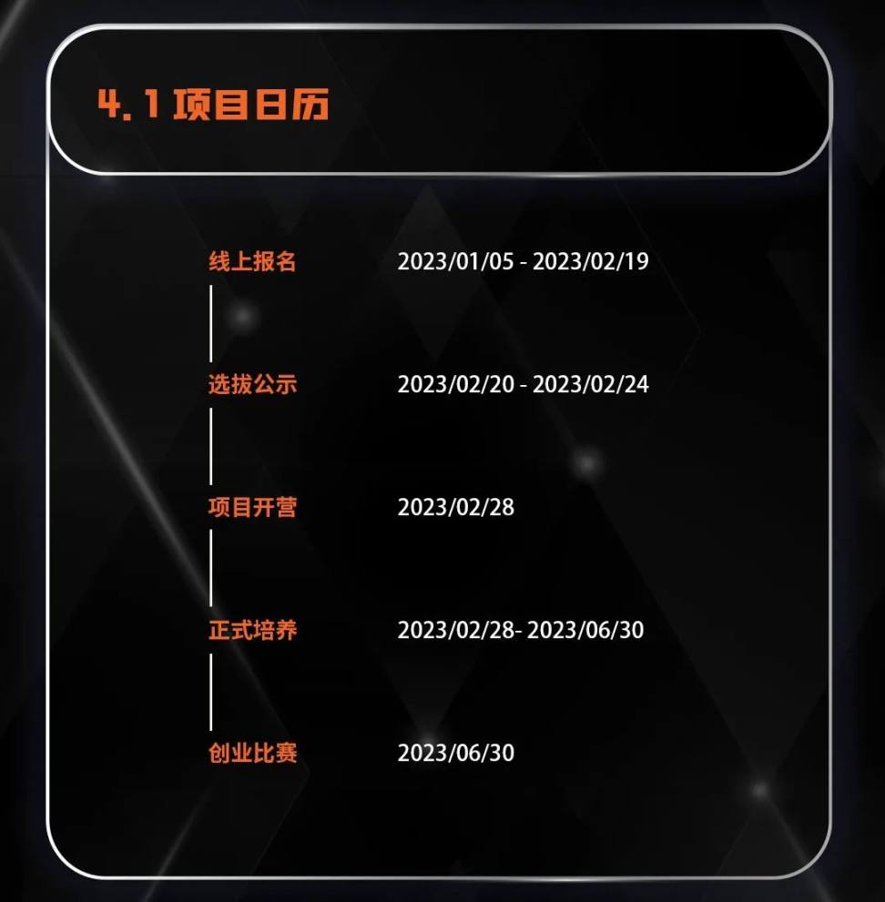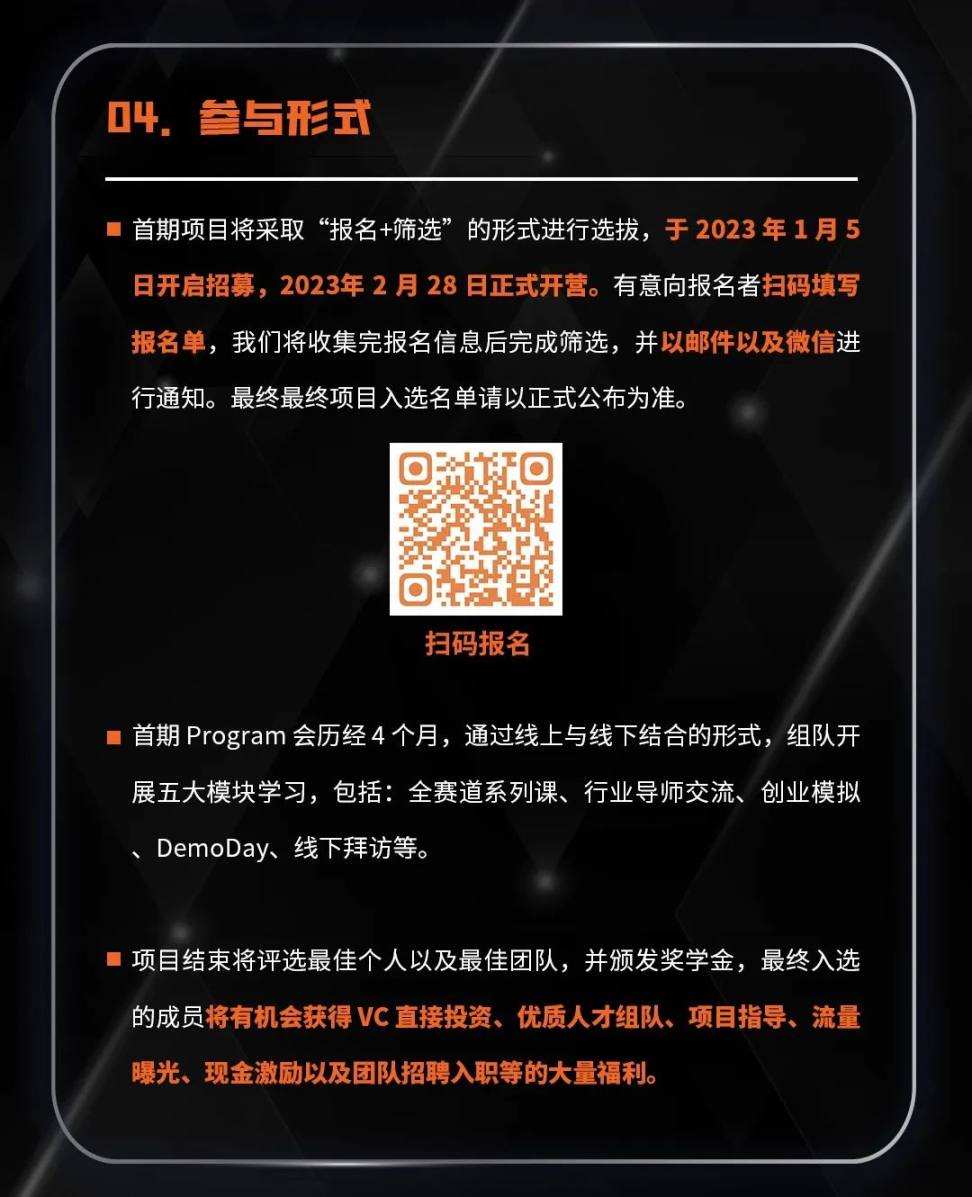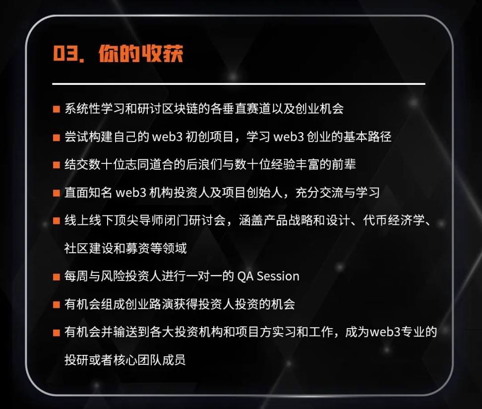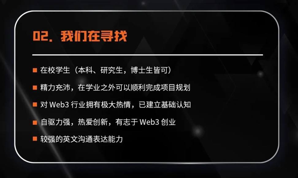 现申请持续开放中,面向有志于 Web3 领域创业的在校生,首期计划申请截止日期延长至2023 年 2 月 19 日,还没有报名的同学还可以继续报名。报名链接:https://tally.so/r/3xV95J。最终录取名单我们将会在2023 年 2 月 27 日前以邮件形式通知到录取同学,并发放后续课程细则。