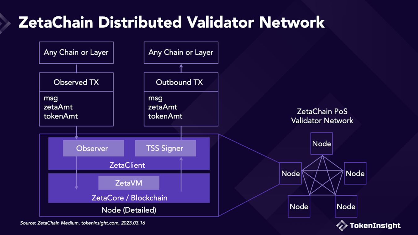 ZetaChain 的跨链通信功能主要靠其网络内的分布式验证节点实现。它计划利用自己网络内的验证节点代替中继器和预言机,帮助验证跨链交易信息并实现喂价功能。