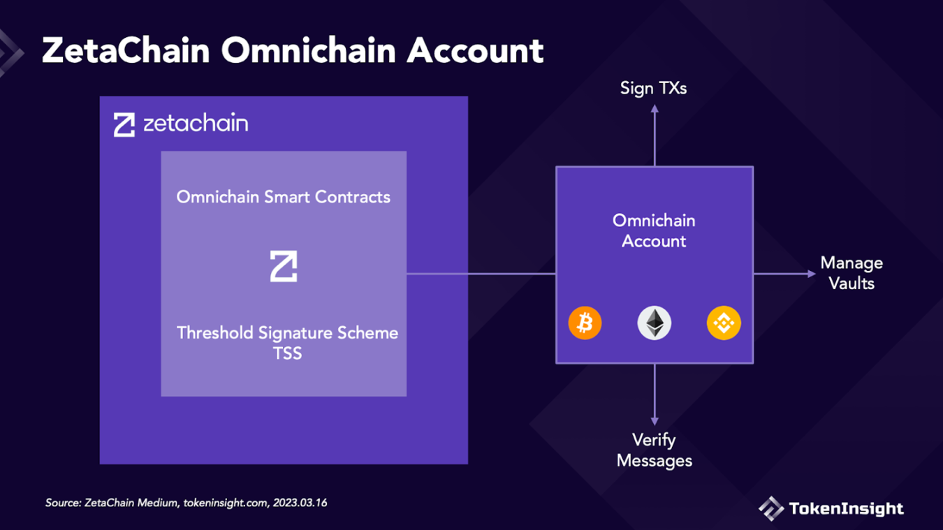 ZetaChain 的 Omnichain 账户允许用户连接包括智能合约平台、非智能合约平台在内的全部区块链网络,以实现资金的全链跨链转移。它作为交易的基站,用于管理和验证与外部链相关的交易。具体交易验证由阈值签名方案 TSS 支持。