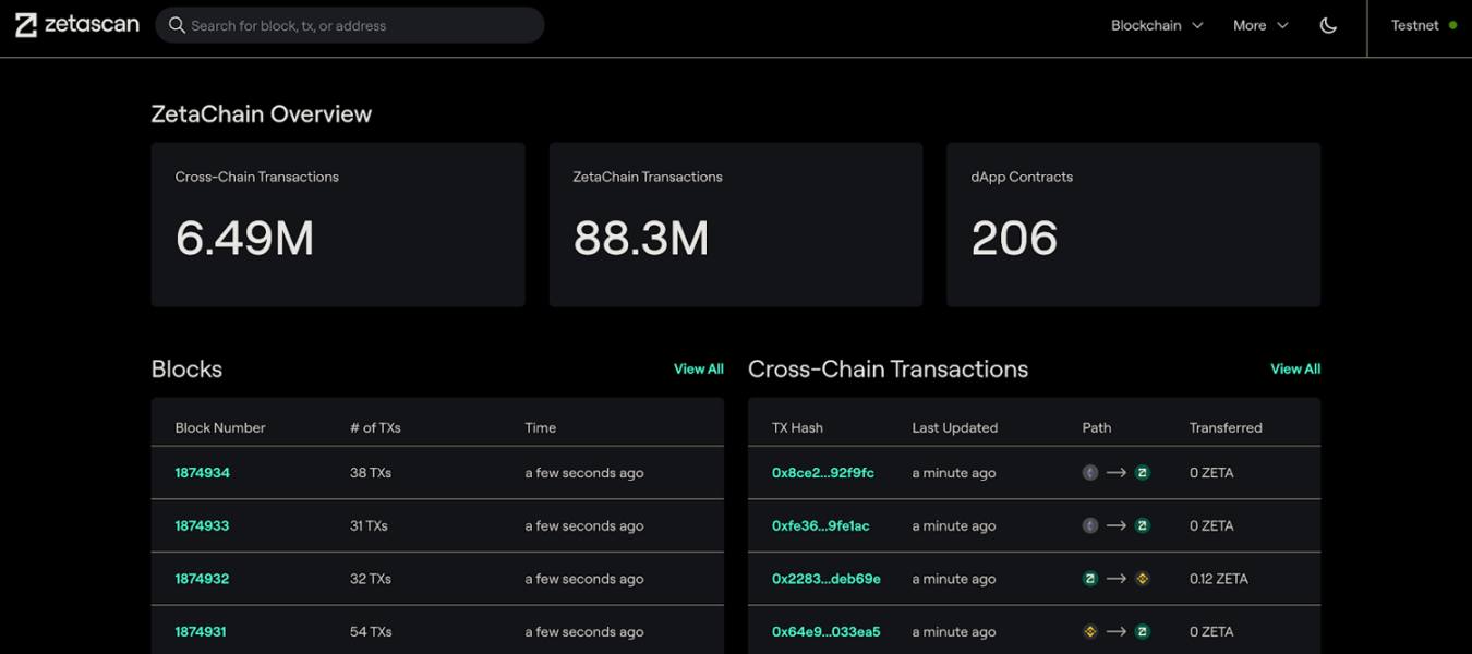 针对测试网相关链上数据,ZetaChain 发布了自己的区块链浏览器,Zetascan。Zetascan 可以观测 Athens-2 测试网的运行情况,数据维度包括跨链交易数据、ZetaChain 本地交易数据、DApp 合约部署数据等。