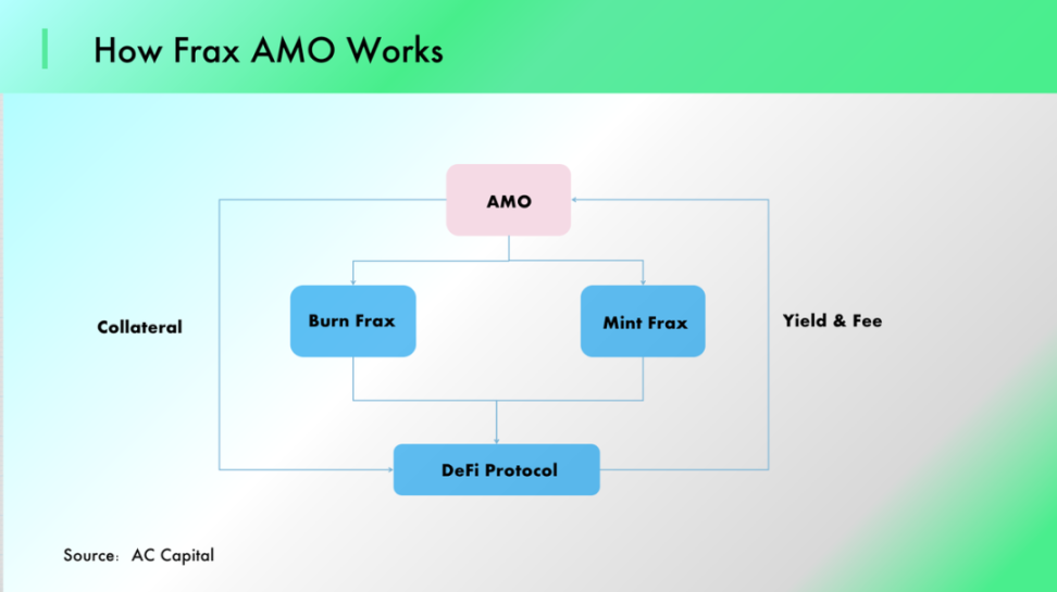 Frax 最早于 2019 年开始立项。与 MakerDao 相比,Frax 最大的不同在于其所采用的双代币机制支撑算法稳定币部分抵押部分抵押(fractional-algorithmic stablecoin)。为实现稳定币治理的价值锚定并提升资金的利用效率,Frax Finance 在 V2 版本中创新推出自动做市场机制(AMO)。在这样机制设定下,AMO 可以灵活调节 USDC、FRAX 在 FRAX3CRV Curve 中的比例,由此确保 FRAX 与 USDC 的锚定关系。