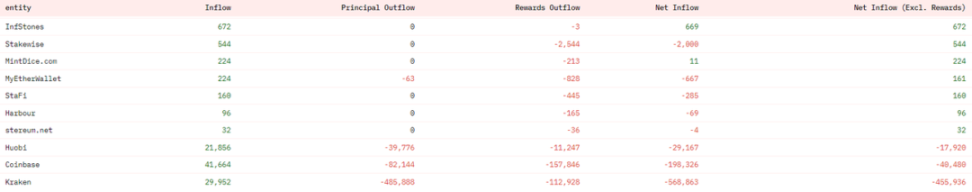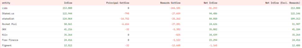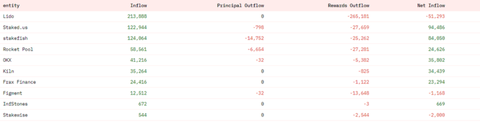 Staking Pool 中,Staked.us 净流入 122944 ETH,stakefish 净流入 124064 ETH(仅 4.26 日内大幅度流入 31328 ETH),Kiln 净流入 35264 ETH。