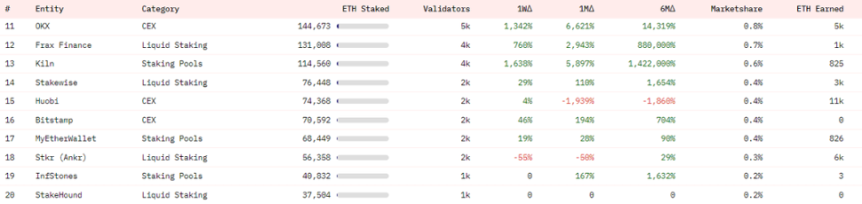 CEX 的质押市场整体份额降低:CEX 当中的 Coinbase、Kraken、火币的市场份额大降,在头部交易所中,OKX 唯一实现净流入的且表现极好。