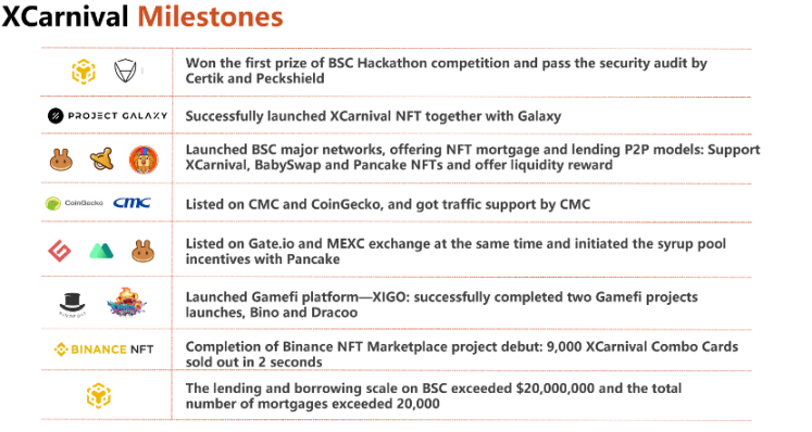 3.上线BSC主网,推出NFT抵押借贷P2P模式:首批支持XCarnival、BabySwap和Pancake等项目,并启动流动性奖励