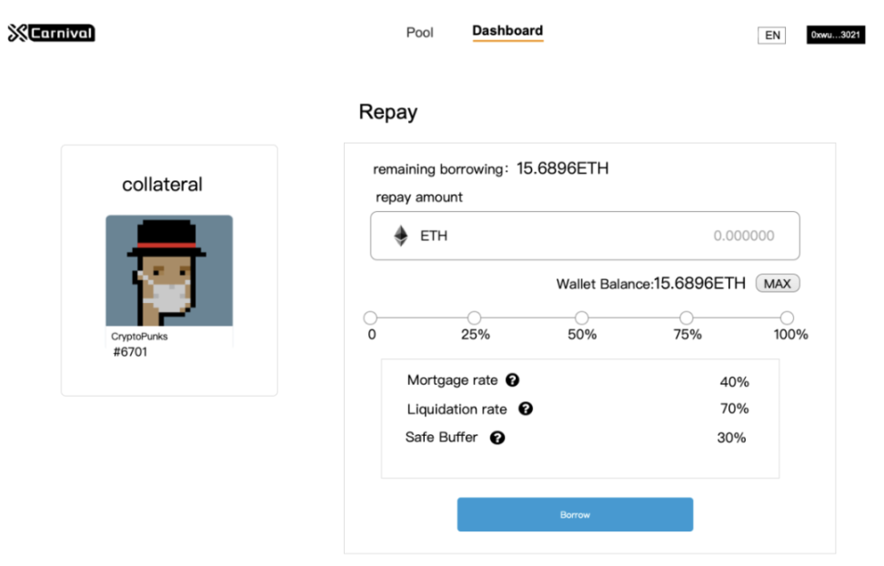 用户Alice手中有一些NFTs,价值约为1000美元,但是她想要将其抵押,借一笔资金用于投资其他项目,她可以在XCarnival平台上将自己的NFT设置: