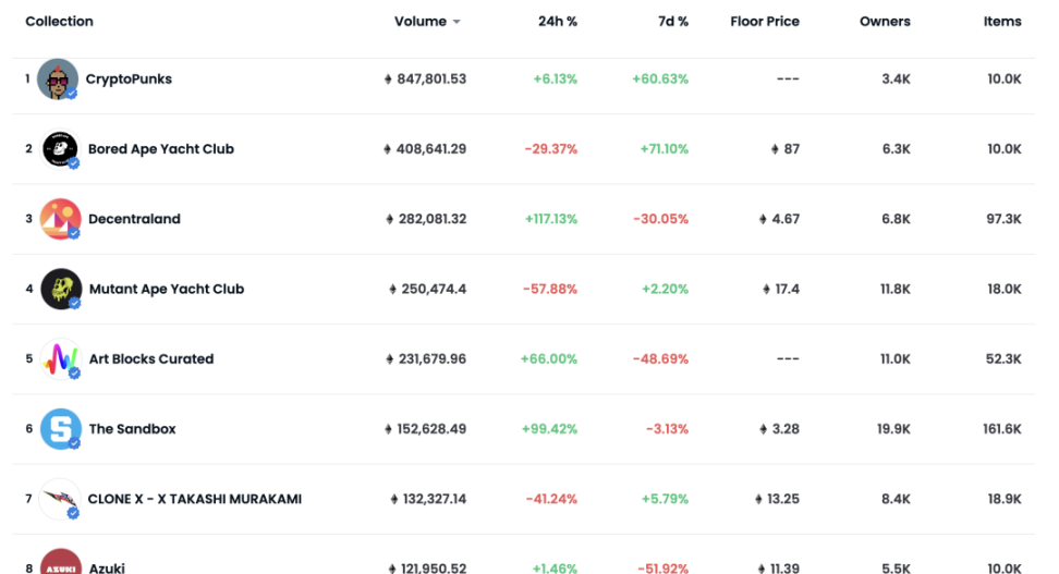 近期NFT市场的持续火热,似乎并未受到整个加密行情的影响,反而表现出了其特有的局部躁动,仅Opeasea 上超过 10 万ETH Volume 的系列已经有8个,包括 CryptoPunks / BAYC /Decentraland/ MAYC / Art Blocks / SandBox / Clone X / Azuki等,仅是这8个系列NFT的市场交易额已经接近 100 亿美金。