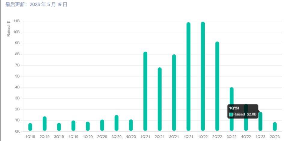 附图是 Web3 VC 融资额趋势图,2023 年 Q2 的 Web3 VC 融资额同比下降~80%。
