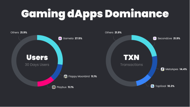 2023 年,BNBChain 发布 4 月报告,Gameta 位居游戏生态第一 dApp,Web3 NFT 游戏平台 Gameta 成为排名第一的 dApp,月活用户量达 123570,在BNB Chain 游戏生态活跃用户总量中占比达到 27.5%。