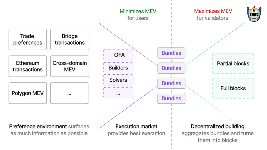 以往的一项解决方案 MEV-Boost,允许区块构建这个工作被外包出去,却间接导致了新的中心化问题:因为大多数区块构建者和中继者,由于马太效应,最终头部平台理论上拥有了对大多数交易的控制权。这种中心化现象对于区块链的去中心化原则构成了挑战。