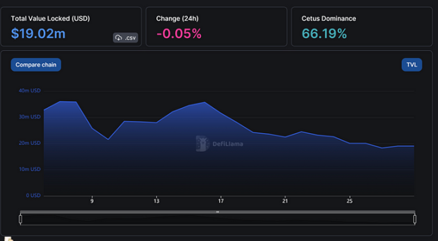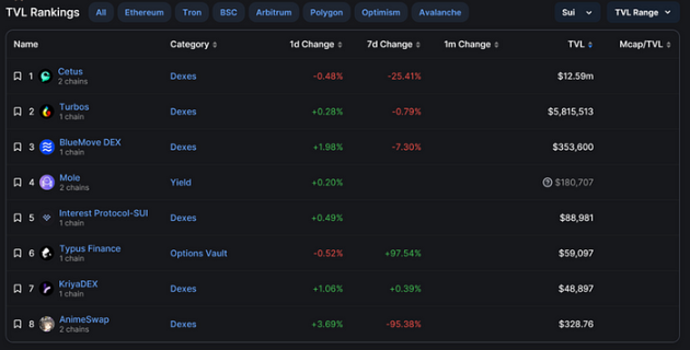 TVL - 目前 Sui 的链上 TVL 为 $19.02m,过去一个月中的峰值为 $36m。