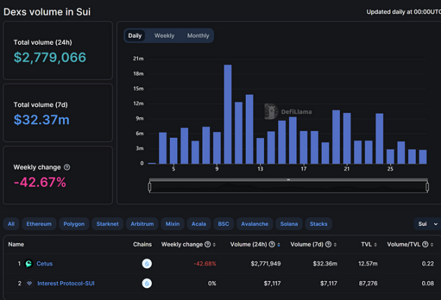 交易量 - 目前 Sui 的 7 日交易量至少为 $32.37m, 位列所有链第 20 位。主要链上交易额发生于 Cetus。