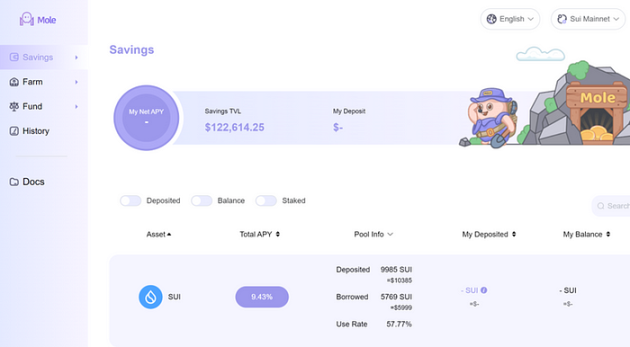 Mole 是一个基于 Sui 以及 Aptos 的收益聚合器,支持单币和双币两种机枪池模式,同时拥有类似 BNB Chain 上 Alpaca 的杠杆挖矿功能。目前 TVL 为 $18 万。