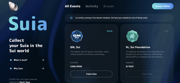 Suia 是一个基于 Sui 的活动 NFT 和社交平台。用户可以在 Suia 铸造各种活动纪念 NFT,追踪项目相关 NFT 活动。