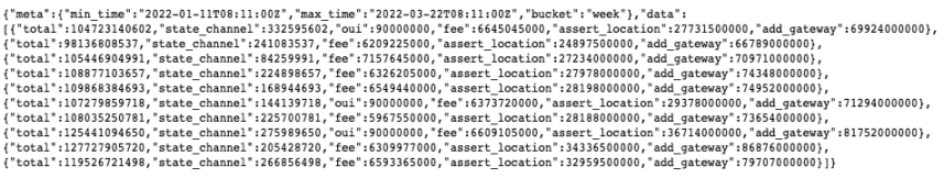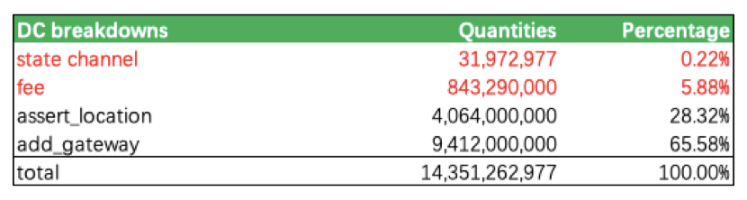 我们查询了这个API,并且得到了2022年第一节度(1月-3月)的Data Credit分类数据。在一笔完整的DC支付统计中,其中只有state_channel和fee代表涉及到用户交易的DC支付;其余的OUI,Add_gateway和Assert_location都是矿工支付的项目,是矿工安装热点,需要交纳给Helium网络的费用。