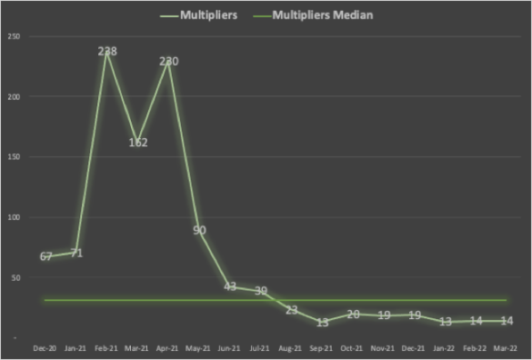我们计算了从2020年12月至今的所有平衡价格乘数,计算出中位数大约为31,而目前为14。说明市场价格是平衡价格的14倍。