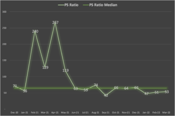 MC/ NTM Total Revenue Ratio,代表流通市值除以未来12个月总收入的比值,也可以理解为一种PS ratio的近似值。我们可以算出,从2020年12月到2022年3月,HNT的流通市值除以Data Credit燃烧总量,为上图所示。可以看到中位数大约是65,目前为53。