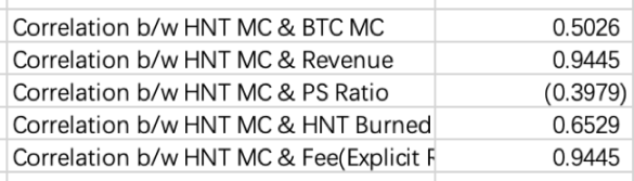 可以得知,HNT的价格和收入的相关性高达0.9445,与BTC的相关度只有0.5。有理由相信,当收入越来越稳健的时候,HNT是一个相对独立于crypto行情的板块,投资者更倾向于对他的价格进行单独估值,而不仅是加密活动的溢出效应。