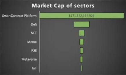 根据Coingecko,IoT板块的市值为128亿美金,是众多板块中最小的。总市值为$12,880,312,522,相比之下,最大的Smart Contract Platform(类比俗称的L1板块)的市值为$771,572,167,923。
