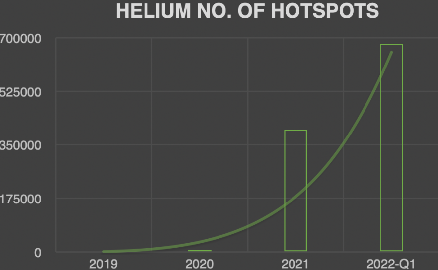 Helium 是一个去中心化的无线网络区块链,旨在为支持 LoRaWAN 和5G标准的物联网设备提供开放、大范围的全球无线网络覆盖。目前,Helium 区块链上已经有大约68万个热点,而在3年前,这个数据只有2,000个。