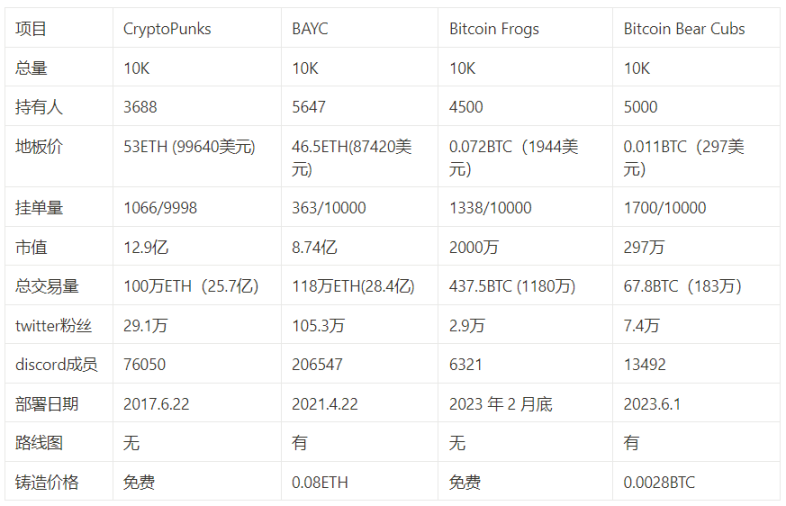 从项目定位以及属性来看,Bitcoin Frogs 都与 CryptoPunks 类似,同样是免费铸造,无路线图,主要靠社区贡献发展。而社交数据上 Frogs 均与 Punks 为 10 倍的差距。市值则是相差了 65 倍左右。