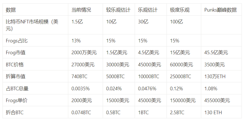 比特币 NFT 市场中 Bitcoin Frogs 具有成为比特币最具代表性蓝筹 NFT 的潜力。其定位类似 CryptoPunks。下面可以给出几种情况下的预估数据: