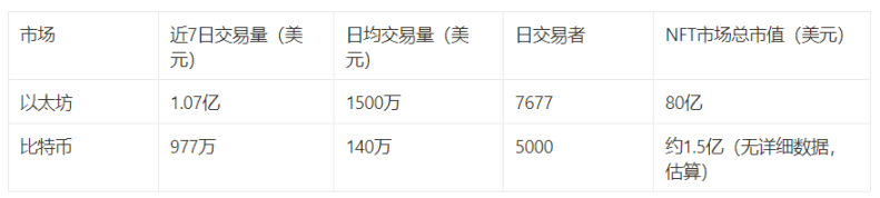 可以看到,从总市值方面来说,以太坊 NFT 市场约为比特币市场的 50 倍左右。