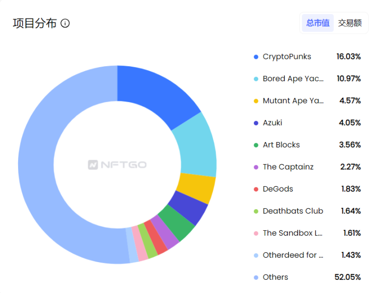 BAYC 排名第二,为 46 万 ETH,约 8.74 亿美元,占比 11%。