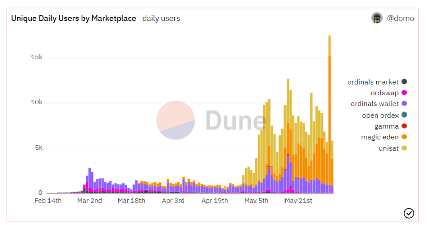 而比特币 NFT 市场方面,近七日总交易量为 977 万美元,日均交易量 140 万美元。( 因 BRC-20 本质上也是 NFT,有些平台将 BRC-20 数据也统计进入 NFT 数据,此处数据仅指图片类 NFT)。独立交易用户约 10 万人。日交易用户约 5000 人。