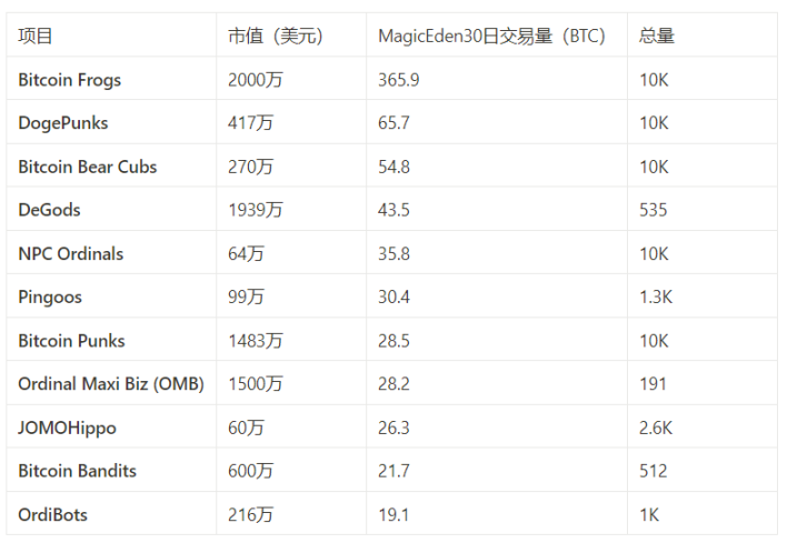 根据 MagicEden 近 30 日比特币上热度最高的 11 个 NFT 项目来看: