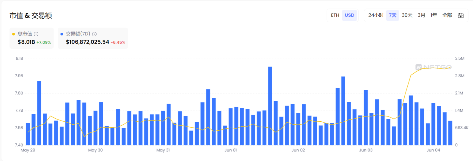 对于以太坊市场,根据 NFTGO 的数据,近 7 日交易总量为 1.07 亿美元左右,日均交易额 1500 万美元左右。