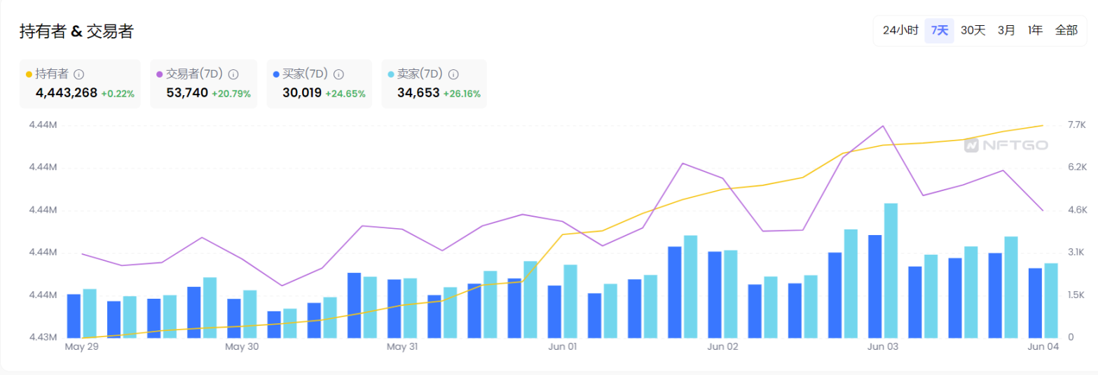 以太坊 NFT 总持有人数为 444 万,近七日交易者 53740 人,日均交易者 7677 人。