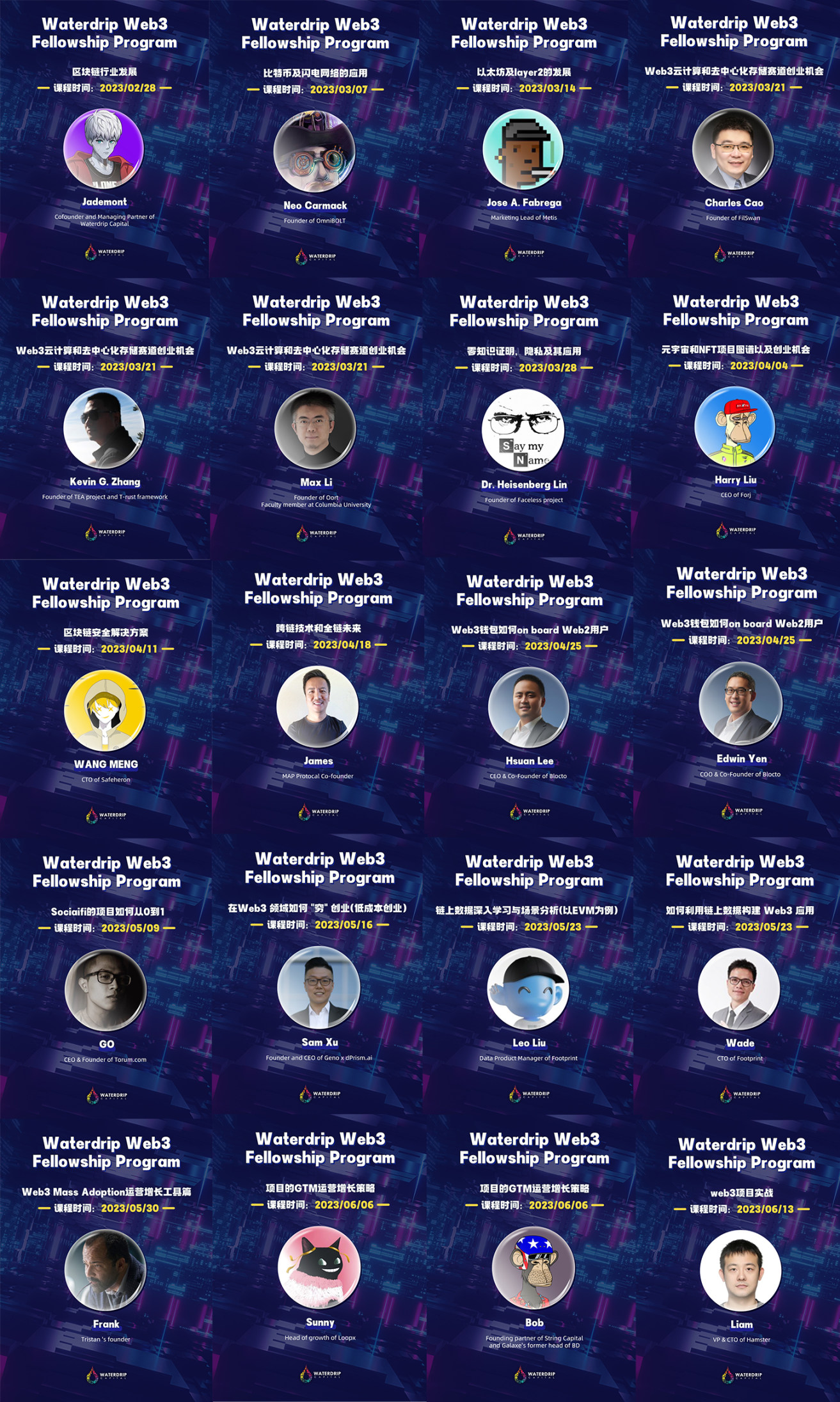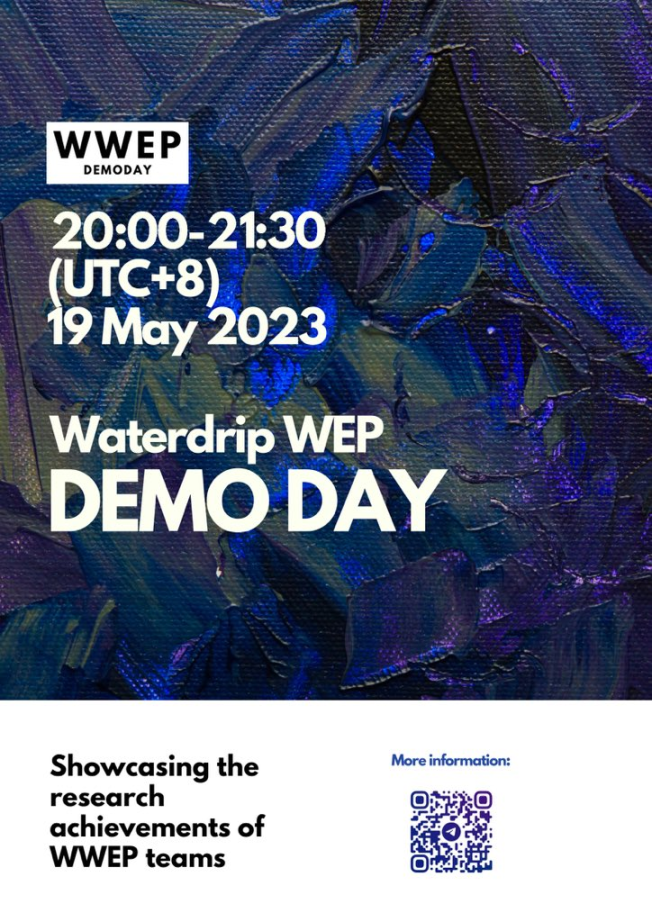 进行完专题课程学习,模块练习,导师交流,线下聚会等各类模块化训练以后,Waterdrip Web3 Entrepreneurship Program 即将推出最后万众期待的成果展示 --- 全球高校创业 DemoDay,这里将为学员们搭建一个展示他们创业项目的舞台,与潜在投资人和行业专家进行对接和交流,寻求投资和合作机会。
