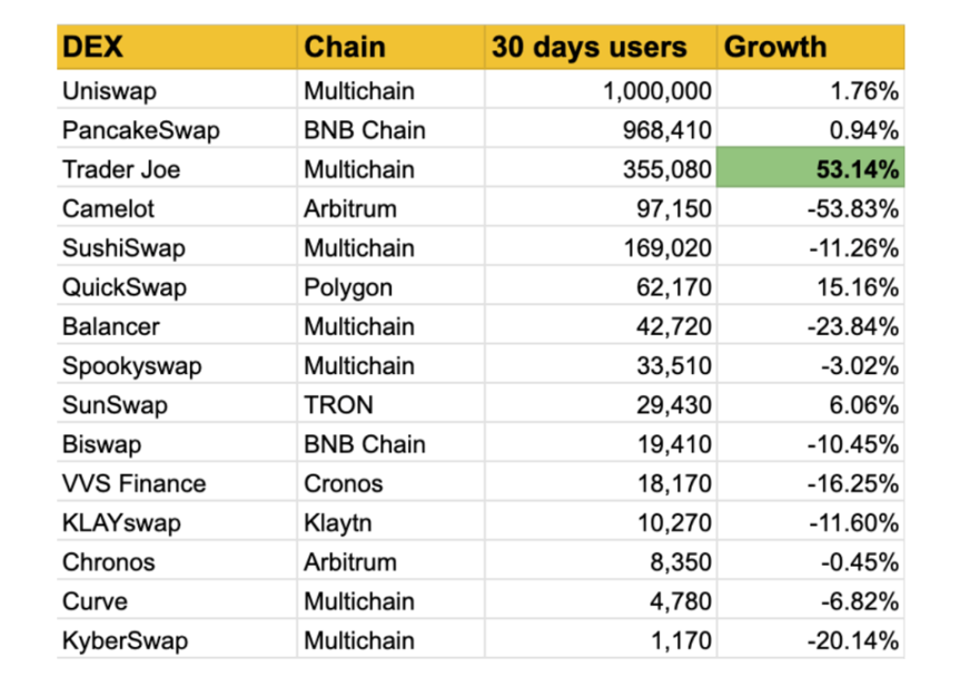 来源:Coin98 Analytics , 各大 DEX 月度用户量统计,