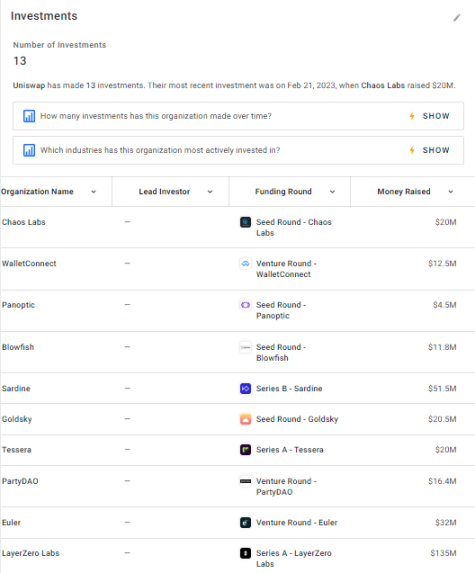 截至 2023 年 5 月,Uniswap 已完成 2 轮融资,总计筹集 1.76 亿美元的资金。最新一轮融资是在 2022 年 10 月 13 日获得的 1.65 亿美元的 B 轮融资——该轮融资由 Polychain 领投,共得到 5 家投资者支持。此外,Uniswap 还成立了一家风投基金,名为 Uniswap Labs Ventures ,至今已进行 13 项针对不同 Web3 项目和公司的投资活动。