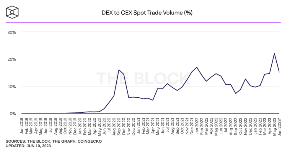 截止 2023 年 5 月,DEX 市场相对于 CEX 市场的即期交易量相对上一年增长 22.05 %。即期交易量是一个用于衡量 DEX 与 CEX 交易量的比例。通过对即期交易量比例的跟踪,我们观察到 DEX 之于 CEX 的交易活动正在逐渐增强,也得以窥见在 2020 年以后的 DeFi 世界被以 Uniswap 领头的一众 DEX 彻底颠覆。