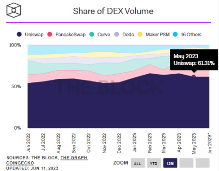最终,在 2018 年 11 月 2 日,Uniswap 正式部署在以太坊主网上。从那时起,Uniswap 开始吸引到更多的用户和流动性提供者,成为加密货币交易所领域备受关注的项目之一。从 2021 年 5 月至今,超过 90 % 的以太坊链上交易都经由 Uniswap 完成。以 2023 年 5 月为例,Uniswap 的交易份额占 DEX 交易市场的 61.31 % 。