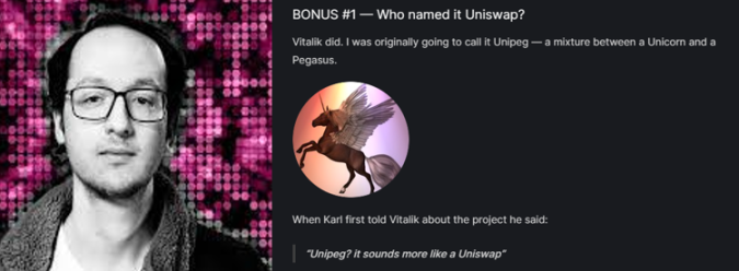 让 Unipeg 得名为 Uniswap 的人正是以太坊联合创始人“V 神”—— Vitalik Buterin 。