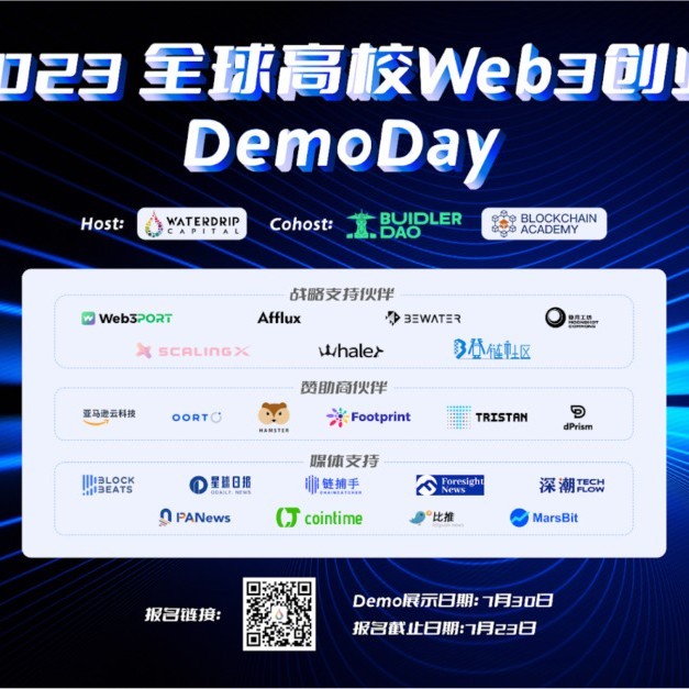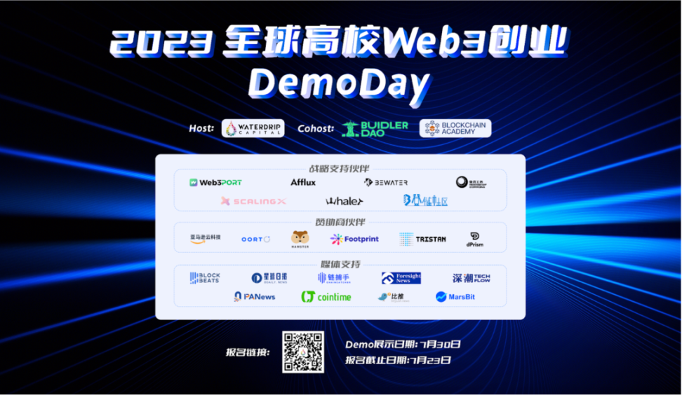 本次 Demo Day 将由 Waterdrip Capital 主办,Buidler DAO、Blockchain Academy 协办,并得到了 Web3Port、Afflux、Bewater、登链社区、登月工坊、ScalingX、捕鲸船社区的战略支持,以及亚马逊云科技、OORT、Hamster、Footprint、dPrism、Tristan 的赞助支持。