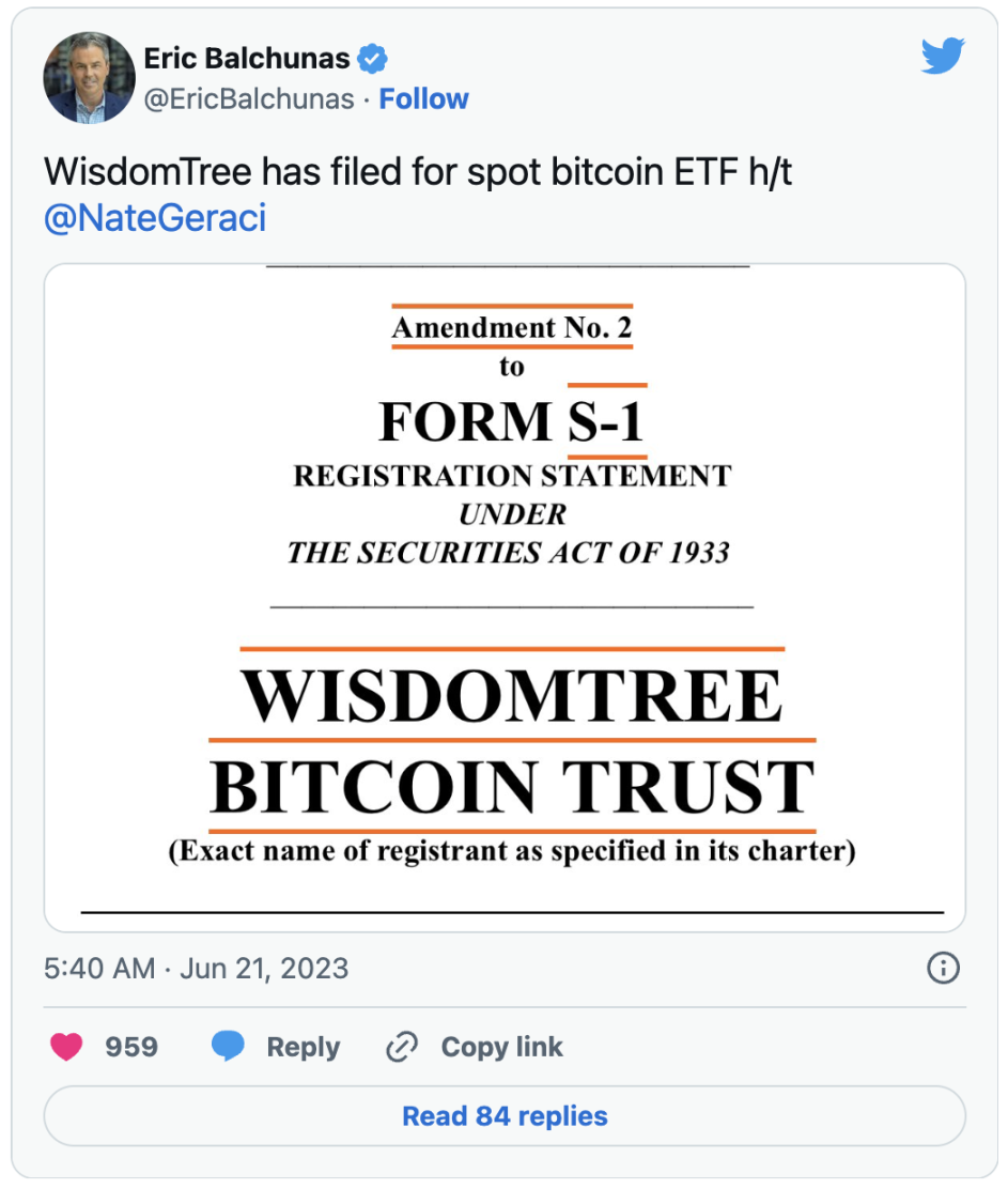 总部位于纽约的资产管理基金 WisdomTree 是最新一家提交新的现货比特币 ETF 申请的投资公司。根据 6 月 21 日向美国证券交易委员会 (SEC) 提交的文件,WisdomTree 请求 SEC 允许其在 Cboe BZX 交易所上市其「WisdomTree 比特币信托」,股票代码为「BTCW」。