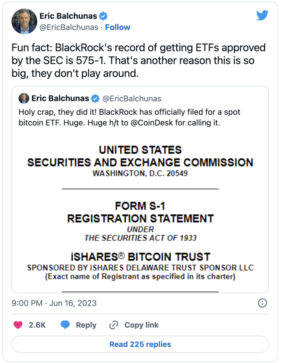 数字资产行业算法交易平台 CoinRoutes 的 CEO 兼联合创始人 Dave Weisberger 表示:「贝莱德 ETF 很可能会获得批准。」他是 ETF 绝对的专家,他在 ETF 领域的渊源可以追溯到 20 世纪 90 年代 Morgan Stanley 最早的 Opals 产品,ETF 的前身。这种乐观情绪的部分原因纯粹是因为这是贝莱德。彭博资讯高级 ETF 分析师 Eric Balchunas 表示,贝莱从 SEC 获得 ETFs 批准的记录是 575-1(只有一次被拒绝)。分析师认为这次获得批准的可能性为一半一半。