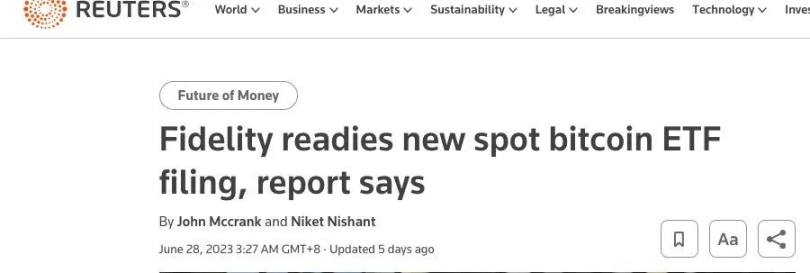 除了 WisdomTree 和 Invesco 最近的动静之外,有传言称,规模达数万亿美元的基金管理公司富达投资 (Fidelity Investments) 可能也在寻求加入这次现货 比特币 ETF 热潮的机会。根据 Arch Public 联合创始人 AP_Abacus 6 月 19 日发布的推文,管理着约 4.9 万亿美元资产的 Fidelity Investments 可能会寻求申请自己的现货比特币 ETF。另外,Abacus 指出,该投资公司可以对 Grasyscale 的 GBTC ETF 产品提出报价。目前 Fidelity 没有回应。
