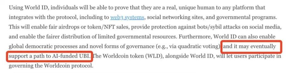所以 WorldCoin 投入了相对巨大的成本单独去生产了数千台 Orb 这样的设备,再把它们运送到各个国家,再在当地雇佣员工或者合作伙伴去推广,这套投入成本是很巨大的,如果真的想做恶不必如此,当然不能因为做恶成本高就认为不会做恶,但做恶成本高是难以做恶的,这个道理也是比特币乃至区块链存在的基本。其次 WorldCoin 在 ZKML 领域的投入也是很高的,这块就不赘述了,如 Scroll 也给予了认可。Worldcoin 的 UBI 一定还是要建立在这两者之上,白皮书中也大概描述了他们对于建立全球统一的身份和金融体系后通过钱包赚钱的方式,即第一点,第二点则很哟意思了,白皮书中说「最终将会走向 AI 资助 UBI 的道路」,这句话留给大家的遐想空间就大了https://twitter.com/jason_chen998/status/1683706919591243778我觉得如果 Worldcoin 成功了,将是一个邪恶的产物,但大概率会失败。虹膜是人类几乎最稳定最持久的唯一标记,比人脸、指纹验证要可靠得多。Worldcoin 的白皮书里面的承诺确实很好,可我们还是需要保持警惕。