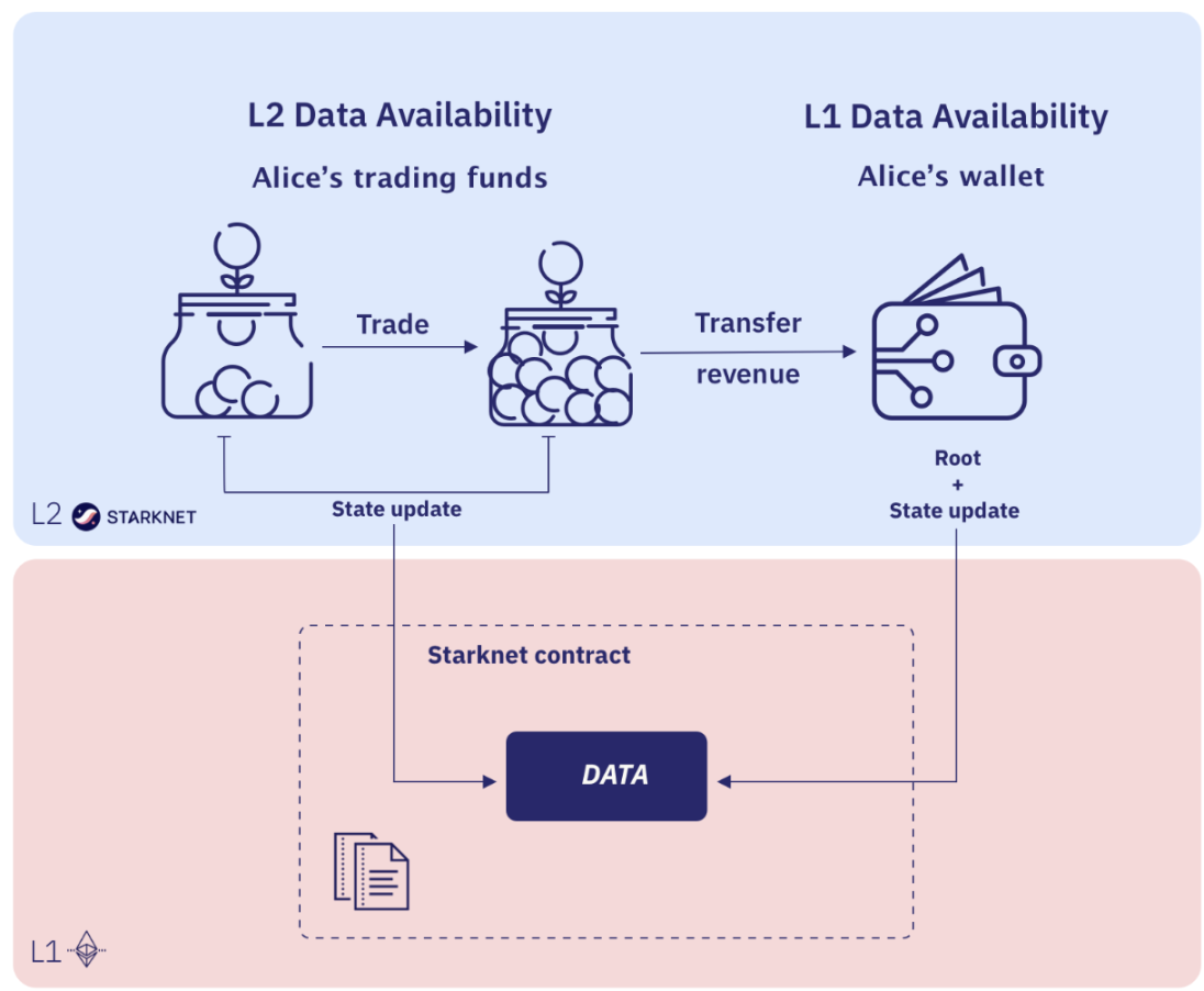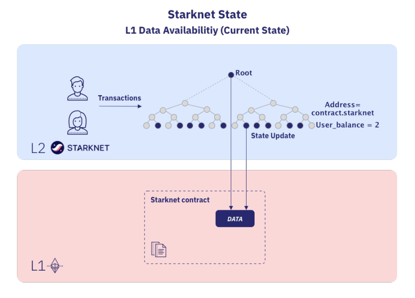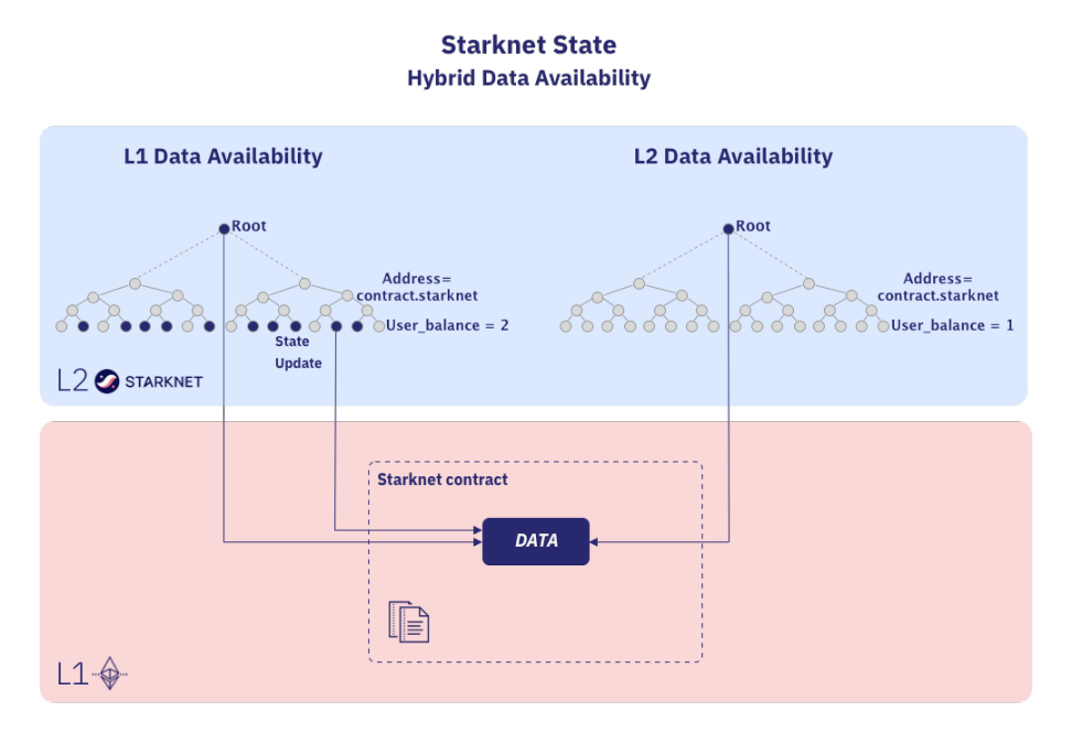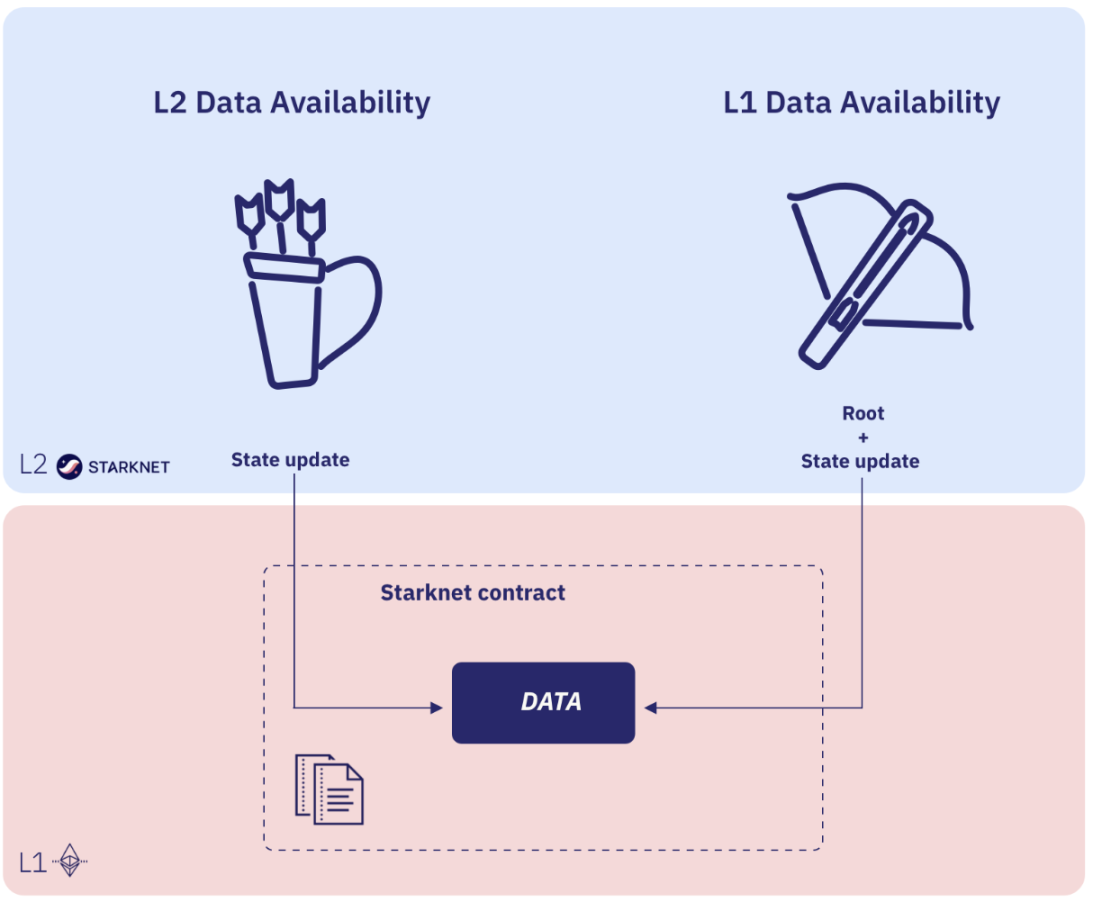 Volition 是通过将 Starknet 的状态作为两个不同的存储承诺树来实现:一个用于 L1 数据可用性模式,另一个用于 L2 数据可用性模式。L1 数据可用性模式树的数据将发布在以太坊主网上,而 L2 数据可用性意味着交易数据将在 L2 上更新,并传递到 Starknet 网络。只有数据的承诺(指承诺树的「根」)才会发送到 L1。