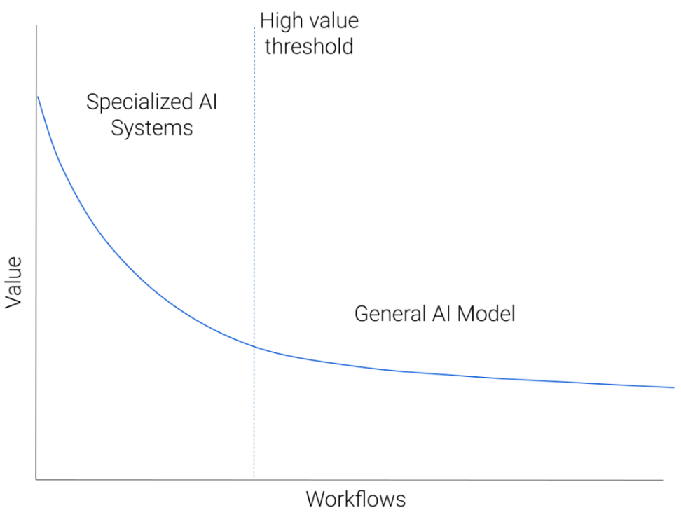 未来的 AI 生态中,通用大模型负责解决长尾问题,高价值的业务场景将由专业 AI 系统来解决。