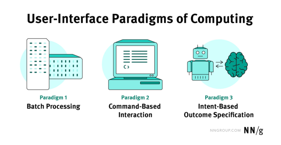 全球顶级的用户体验研究机构 Nielsen Norman Group 在 6 月的一篇文章中提出,LLMs 为核心的 AI 技术将带来计算机出现后的新一次交互范式革命,之所以称之为革命的关键原因在于交互设计工作的目标发生了变化: