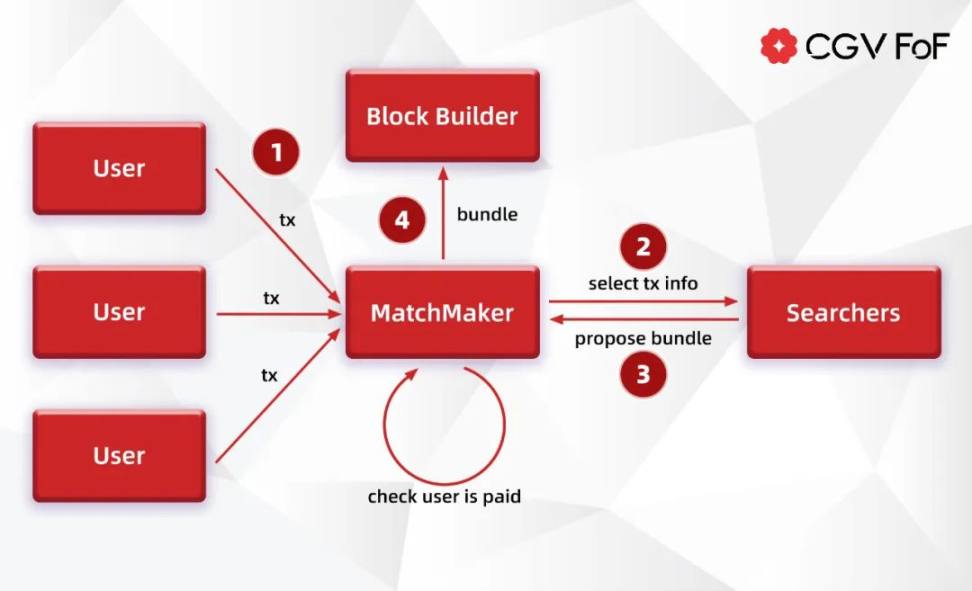 MEV-Share 中引入了 Matchmaker 的角色,作为 User、Searcher、Builder 之间的中介,通过限制对 Searcher 暴露的用户交易信息,来维护用户隐私。